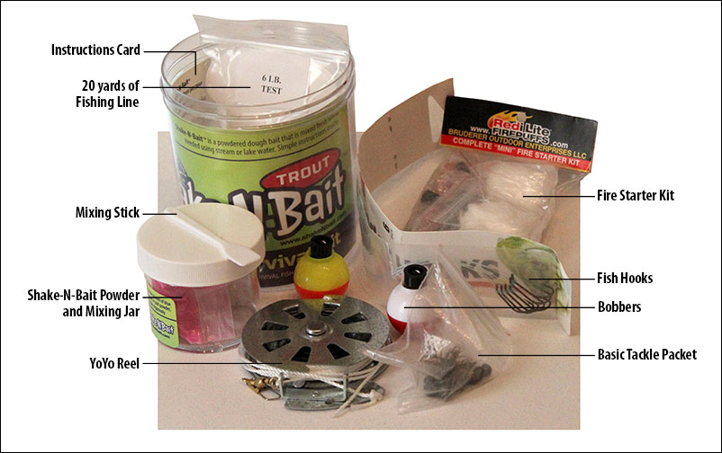 INCLUDES: Shake-N-Bait Powder, Basic Tackle Packet, RediLite Firepuffs™ Firestarter Kit, 20 yards of fishing line, Doughbait fish hooks, Bait Fish Hooks, YoYo Reel, Bobbers, Instruction Card for Bait and Reel.